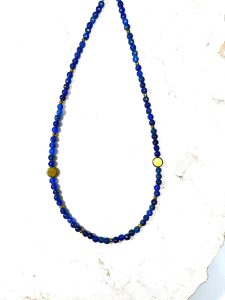 Ένα λεπτεπίλεπτο και κομψό κολιέ της συλλογής 📌semiprecious Φτιαγμένο από φυσικές πέτρες αυτού του ιδιαίτερου έντονου μπλε νεφρίτη. Οι πέτρες του είναι τεσσάρων χιλιοστών κοπής ταγιέ .Ανάμεσά τους λεπτομέρειες από χρυσό αιματίτη μεγέθους 2 χιλιοστών χαρίζουν στο κόσμημα επιπλέον λάμψη