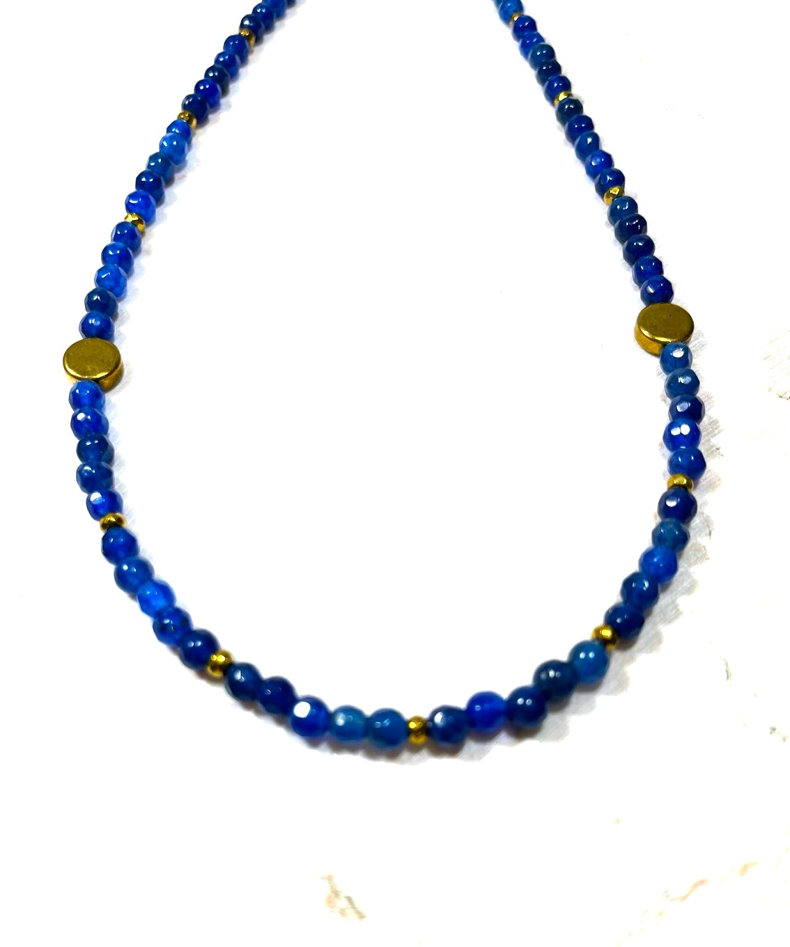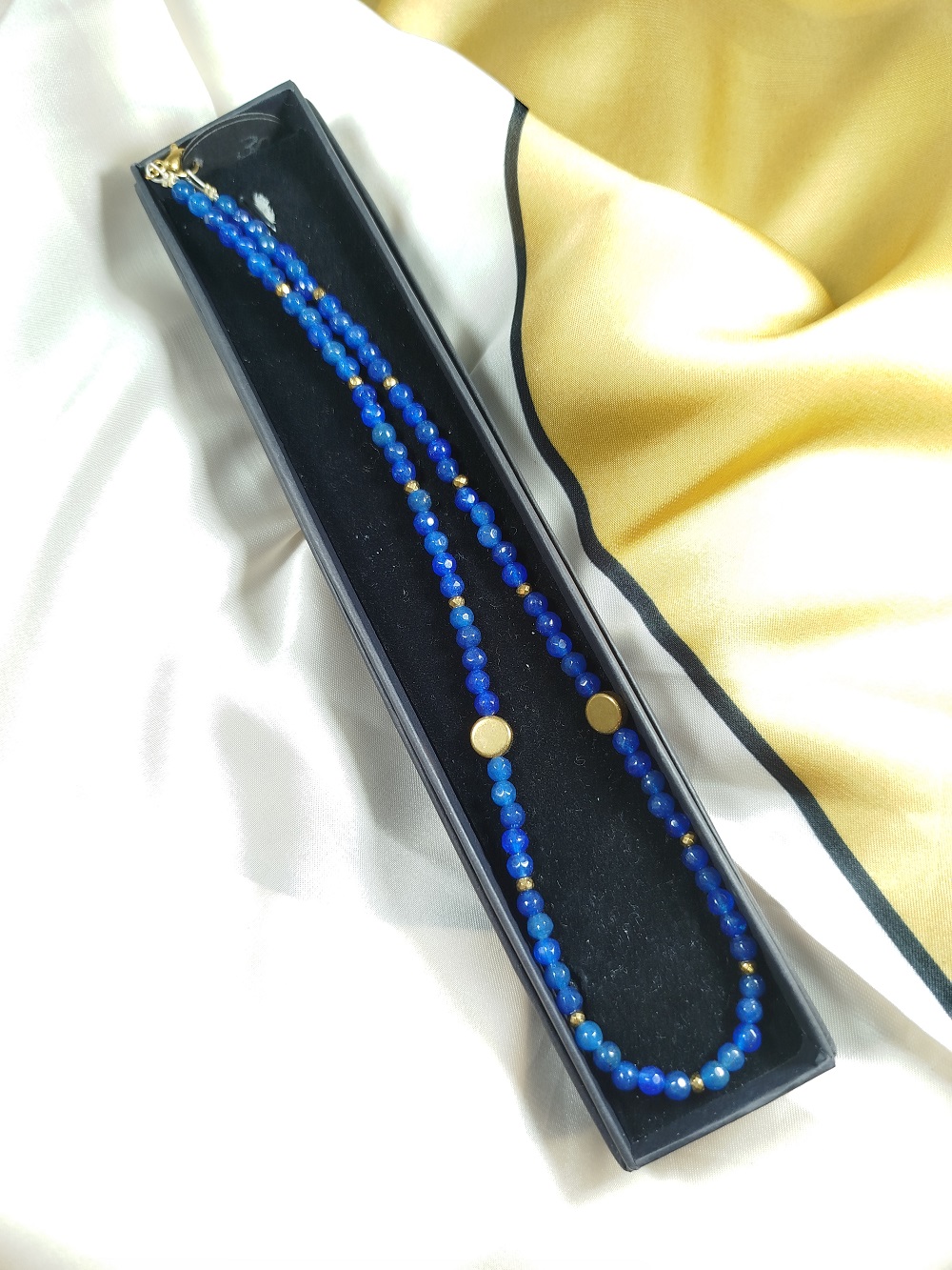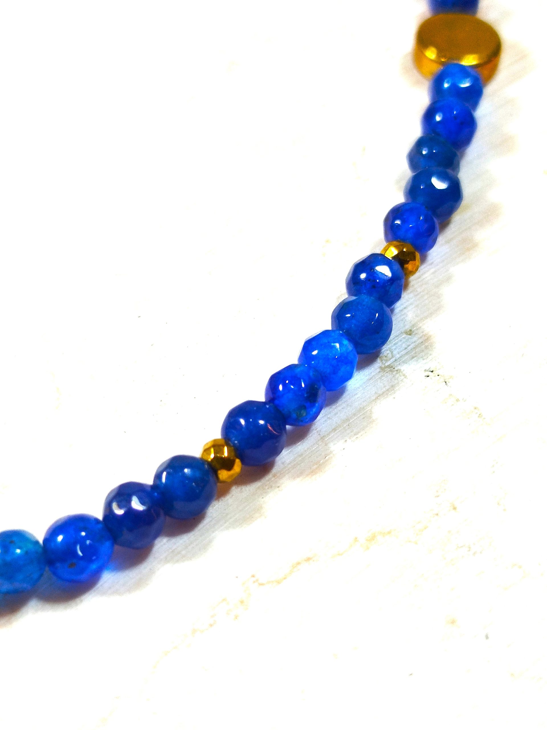 Ένα λεπτεπίλεπτο και κομψό κολιέ της συλλογής 📌semiprecious Φτιαγμένο από φυσικές πέτρες αυτού του ιδιαίτερου έντονου μπλε νεφρίτη. Οι πέτρες του είναι τεσσάρων χιλιοστών κοπής ταγιέ .Ανάμεσά τους λεπτομέρειες από χρυσό αιματίτη μεγέθους 2 χιλιοστών χαρίζουν στο κόσμημα επιπλέον λάμψη