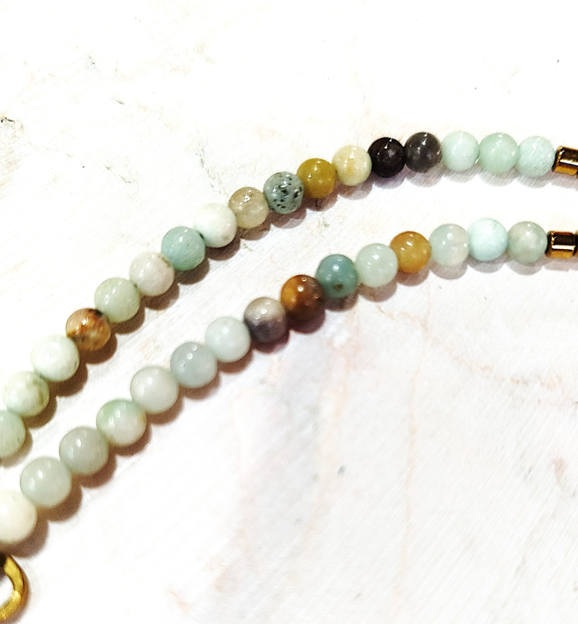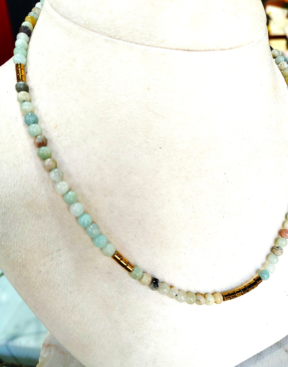 H εκλεπτυσμένη ομορφιά του αμαζονίτη σε ένα μοναδικό, χειροποίητο κολιέ . Οι φυσικές αποχρώσεις του αμαζονίτη – από τιρκουάζ μέχρι απαλό πράσινο – χαρίζουν φρεσκάδα και θετική ενέργεια, ενώ οι λεπτομέρειες από χρυσό αιματίτη προσθέτουν λάμψη και κομψότητα. Το ιδιαίτερο, χειροποίητο κούμπωμα κάνει το κόσμημα ακόμα πιο ξεχωριστό, προσφέροντας μοναδική αισθητική και άνεση στη χρήση. Ιδανικό για όσους αγαπούν τα φυσικά κοσμήματα με διαχρονικό χαρακτήρα.
